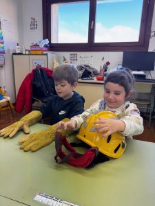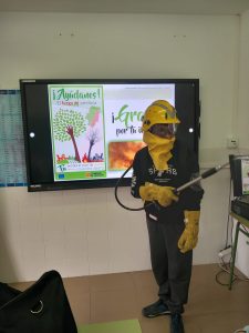 A los más pequeños les contó un cuento donde un viejo roble y los animales del bosque nos explicaban la importancia de prevenir incendios y cómo actuar en el caso de que se inicie uno. También nos enseñó útiles para apagar el fuego y nos dejó probarnos cascos, gafas, guantes y coger una emisora.